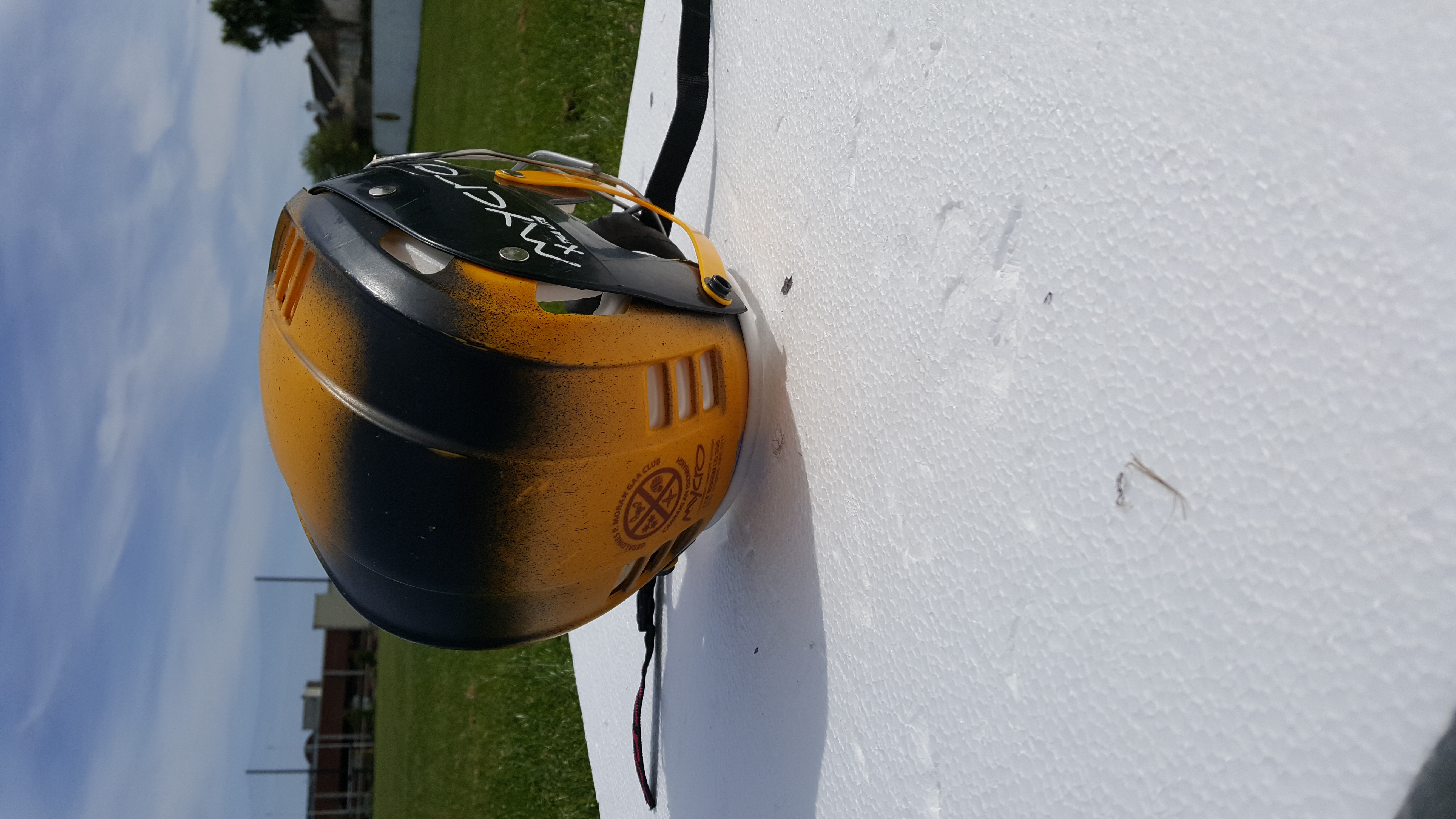 SelectHurling Helmet in Club colours of Black and Amber, with Club Crest, available in Small or Medium (Large also available but dearer as VAT applies)